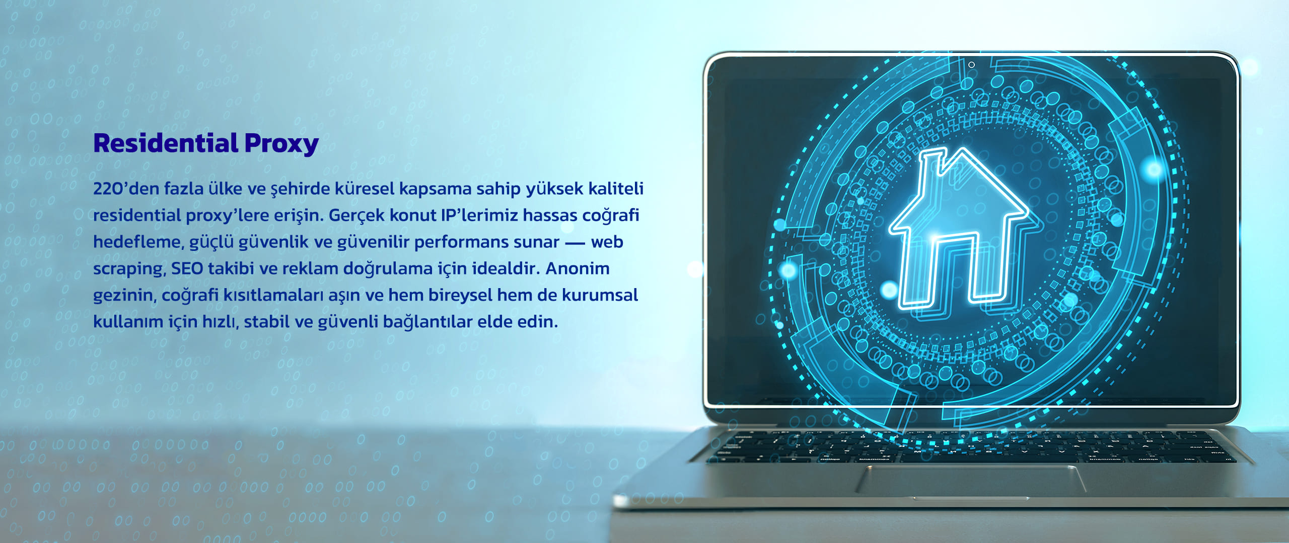 Residential proxy’lerimizle çevrimiçi operasyonlarınızın tüm potansiyelini ortaya çıkarın. Profesyoneller ve işletmeler için özel olarak tasarlanan bu proxy’ler; yüksek hız, güvenilir coğrafi hedefleme ve tam çevrimiçi anonimlik sunar. İster veri kazıma (data scraping), ister SEO izleme, reklam doğrulama ya da birden fazla hesabı güvenli şekilde yönetme ihtiyacınız olsun; 210’dan fazla global lokasyondan oluşan ağımız sayesinde her zaman rakiplerinizin bir adım önünde olursunuz. İhtiyaçlarınıza göre şekillendirilen çözümlerimizle üst düzey esneklik, güvenlik ve performansı bir arada deneyimleyin.