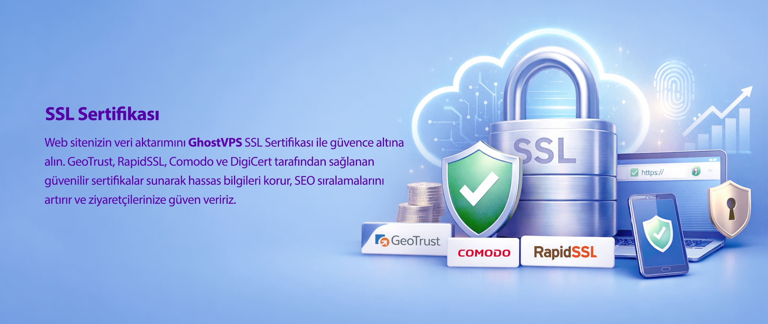 GhostVPS, web sitenizin sektör lideri şifreleme ve doğrulama avantajlarından yararlanmasını sağlamak için GeoTrust, RapidSSL, Comodo ve DigiCert gibi güvenilir global sertifika otoriteleri ile iş ortaklığı yapmaktadır.